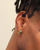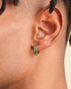 Little pops of color pack a powerful style punch with these gold hoops for men. Our Green Emerald Cut Inset Hoop Earrings are small but bold. Pair with our Green Iced Out Cuban Link Chain for a richly colored look.