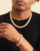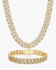 This dazzling duo is the set you need if you like to be the best dressed wherever you go. The gold Iced Out Set includes our 20" 10mm Iced Out Cuban Link Chain and Bracelet. With pavé diamond simulants and a secure box clasp, this combo is everything you need for the most luxurious fit.