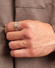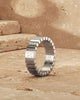 The men's silver Ridge Ring showcases over 20 ribs that run vertically around its band, boasting precise details and powerful, structural design. The Ridge Ring balances the sophistication of a dress ring with the simplicity of an everyday accessory.