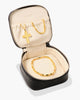 Keep your favorite jewelry pieces safe at home and on the go with our Black Travel Jewelry Case. The vegan leather exterior has a metallic sheen for a modern feel and a hard shell, perfect for travel. The interior has a super soft vegan leather lining and includes a pillow to keep your chains and other precious jewelry items safe from damage. Place smaller accessories like earrings and rings in the soft and secure pocket.