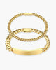 Stand out with the gold Cuban Link ID Bracelet Stack, a powerful pairing designed for presence and personalization. This set includes our bold 8mm Cuban Link ID Bracelet with an engravable plate, stacked with the 5mm Cuban Link Bracelet for a clean, layered look. Both bracelets are finished in radiant gold and secured with our upgraded signature box clasp for unmatched durability and shine. From daily wear to statement occasions, this stack delivers timeless style with a personal edge.
