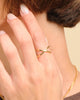 Introducing the Women's X Ring in gold. Its delicate yet distinctive design mimics two intersecting bands, creating an effortlessly chic aesthetic that pairs beautifully with any outfit, making it a versatile staple in your jewelry collection.